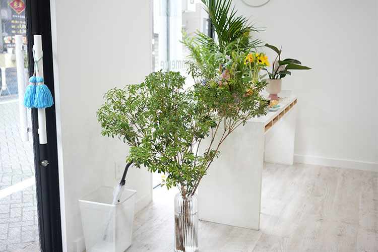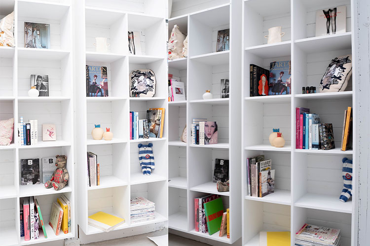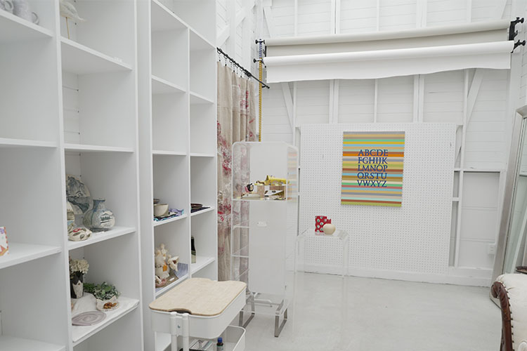 白基調のおしゃれすぎる館内。 棚には写真映えする要所が沢山陳列されております。撮影時の小道具としても使用できます。